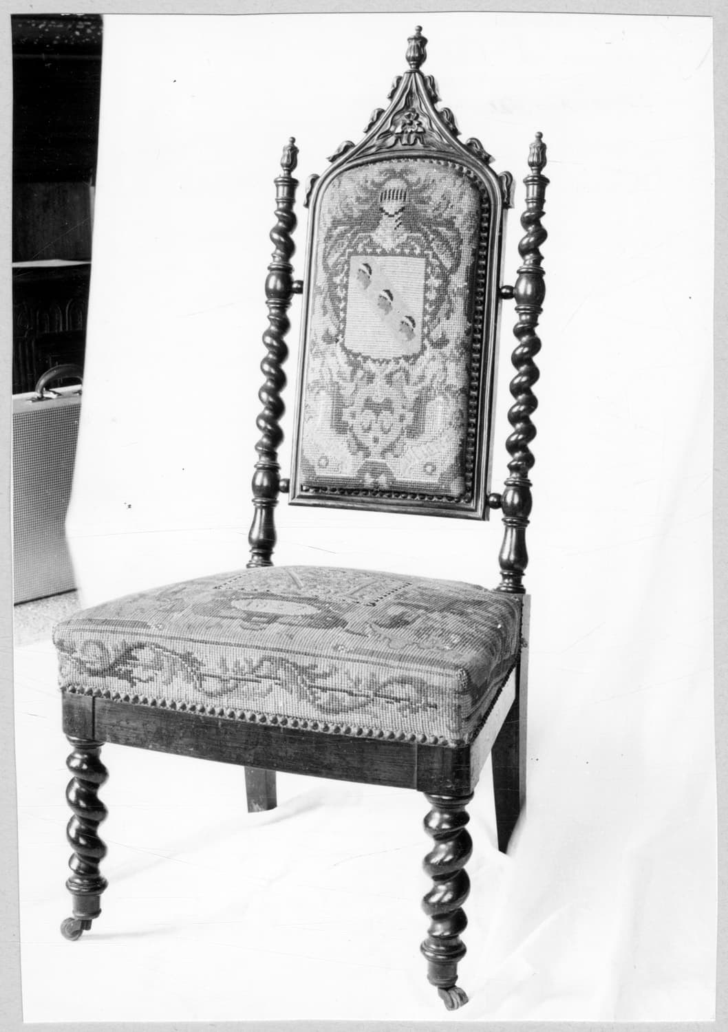 chauffeuse dont le piétement avant est tourné et l'arrière est droit. dossier tourné terminé par des toupies. tapisserie au point ornée d'un blason et d'un casque vue de face