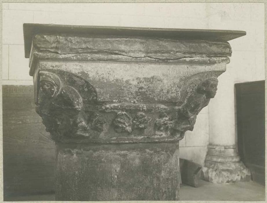 cuve carrée à margelle nue supportée par 4 personnages accroupis : un moine, un chevalier, un manant, et une femme placés dans les angles abattus ; sous la margelle des feuilles en reliefs ; couvercle en bois