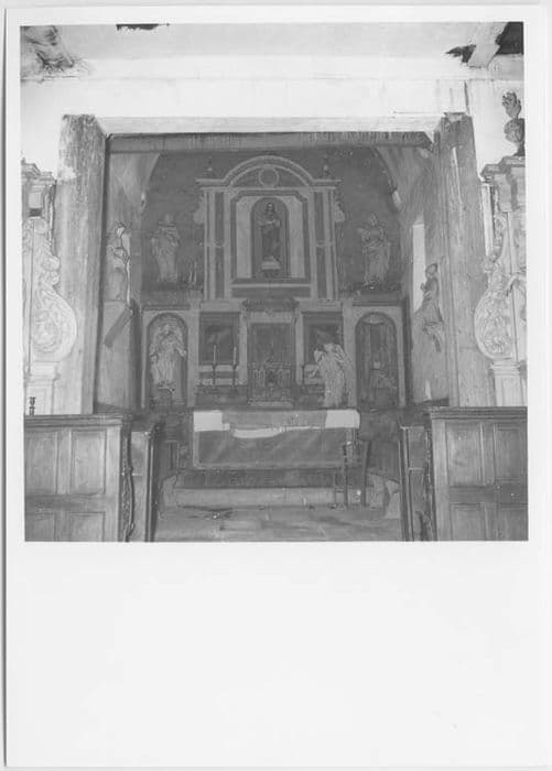 le retable est composé d'une prédelle ornée d'anges sculptés ; au dessus 2 panneaux peints avec 2 colonnes corinthiennes les séparant des niches ; dans la partie supérieure du retable, décor mouluré avec niche centrale au dessus duquel se trouve un fronton en arc ; tabernacle mouluré à niches avec une statuette du Christ au centre, surmonté d'un dais