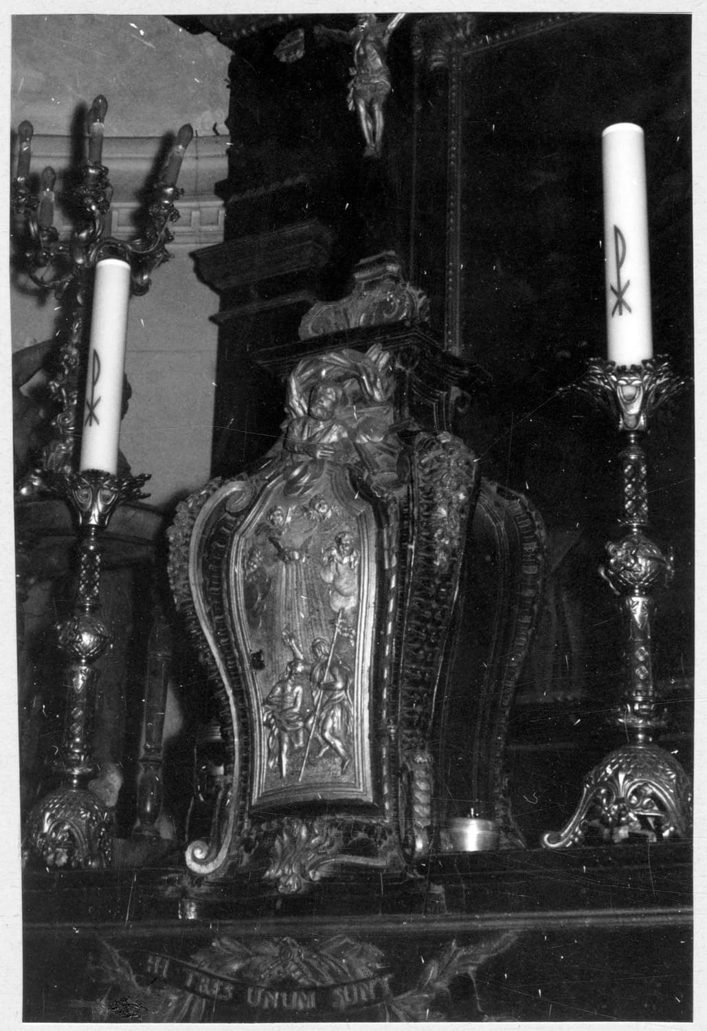 les coins sont décorés par des volutes ; représentation du Baptême du Christ sur la porte du tabernacle
