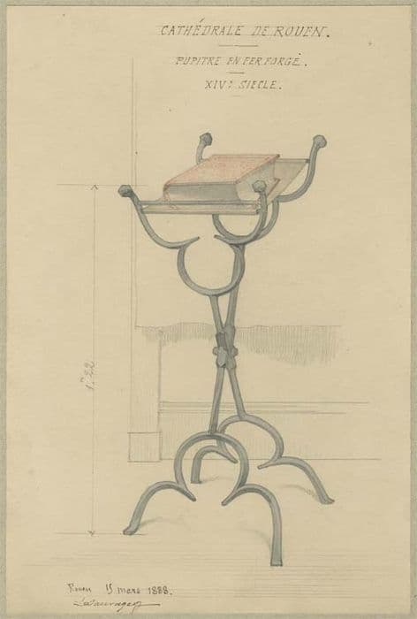 EV 601. Chaque tige est terminée haut et bas par deux branches formant un trèfle ouvert. Les deux branches de l'inférieur servent de pieds ; celles du supérieur, terminées en boule sont réunies par une traverse où est fixé le cuir qui porte le livre et maintient l'écartement. Une tige portée sur un étrier articulé sur le trèfle antérieur, et terminé en binet, et maintenue par un crochet sur une traverse, sert à éclairer le livre.