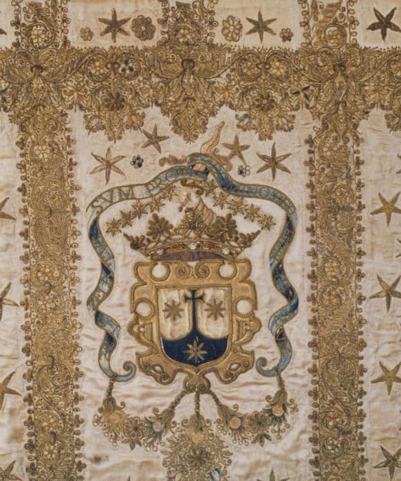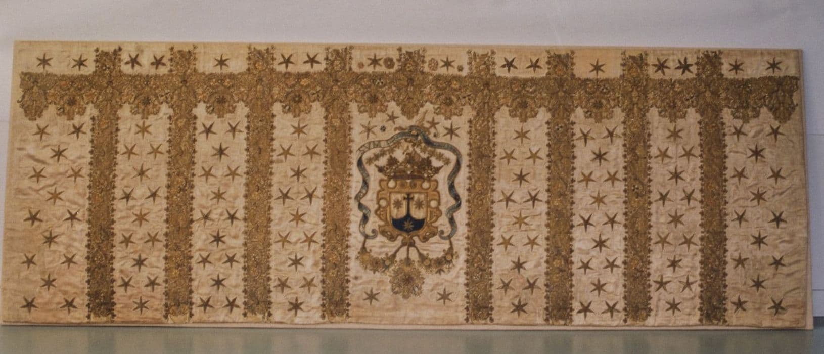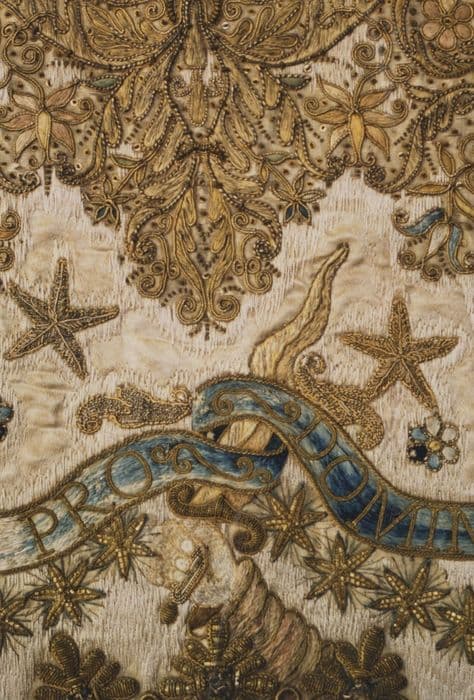 matériau textile : satin, brodé ; fil métal : doré, filigranes