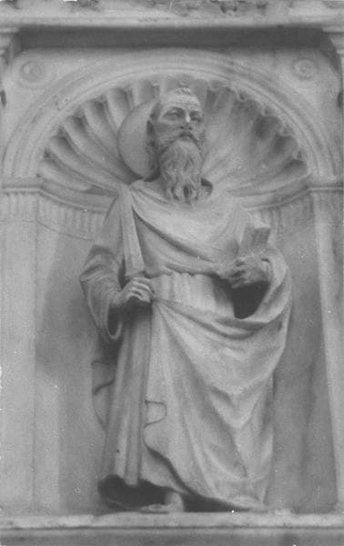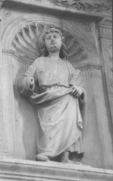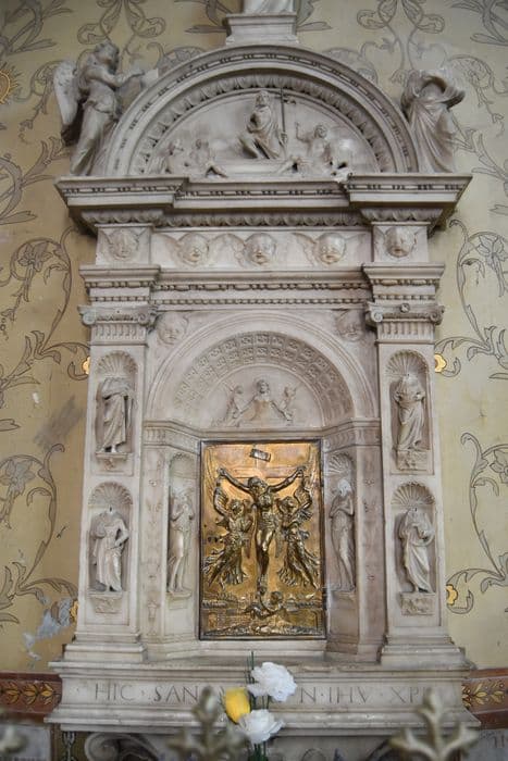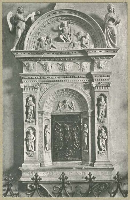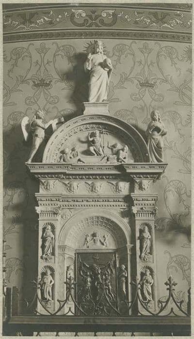 reliquaire composé de niches avec statuettes, colonnes ioniques surmontées d'un entablement orné de frises (oves, perles) ; fronton semi ; circulaire avec au centre une représentation sculptée : Jésus sortant du tombeau ; au sommet Jésus tenant le globe accompagné de 2 anges