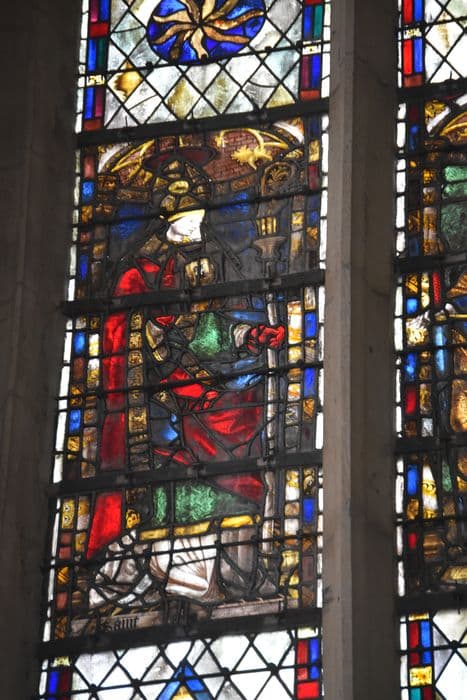 verrière à personnage : saint Pierre, le Christ bénissant, la Vierge, saint Jean ; fond architecturé ; dans le tympan : la Trinité