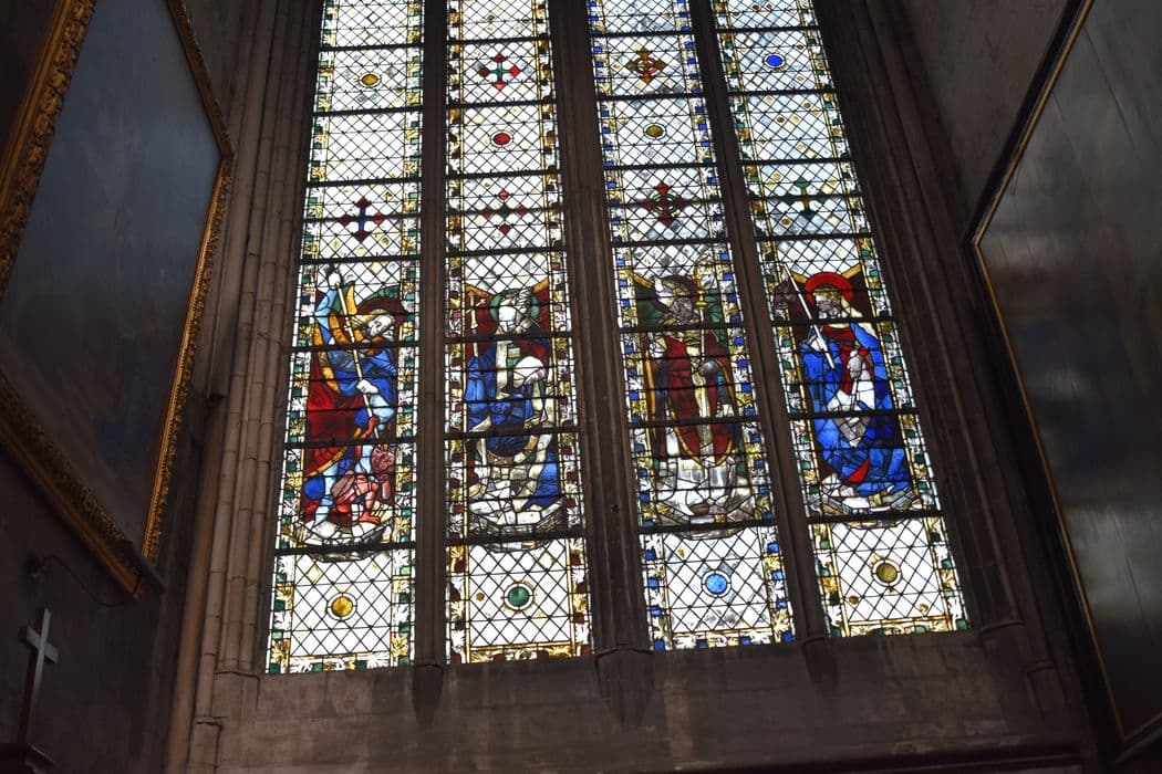 verrière de la chapelle Saint-Julien : saint Julien, saint Nicolas, saint Romain et saint Gudule