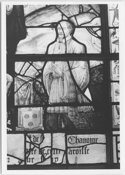 Crucifixion ; chanoine : en donateur, agenouillé ; armoiries