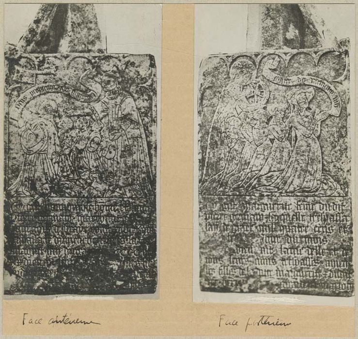Les effigies du défunt et de ses quatre fils sont gravées sur une face, tous en prières, assistés de saint Etienne, patron de la paroisse. Sur l'autre face de la stèle, sont les effigies de la défunte et de ses trois filles en prière, assistées de sainte Catherine.