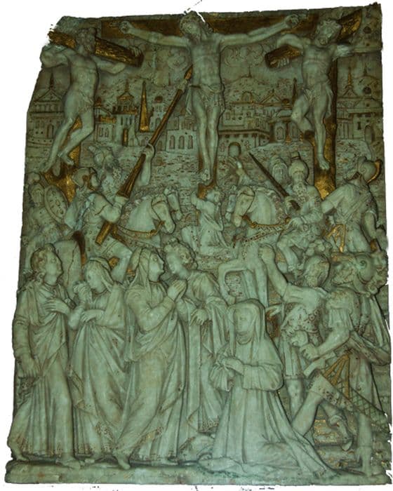 bas-relief : Le Christ en croix entre les deux larrons et une donatrice