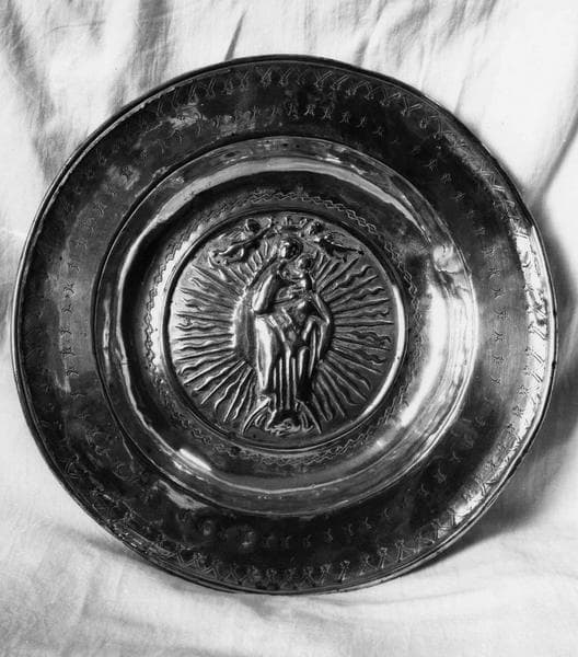 Une Vierge à l'Enfant couronnée par des angelots orne le centre du plat.