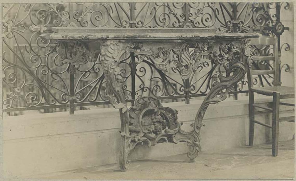 Consoles recouvertes l'une d'un plateau de brèche violette, l'autre d'un plateau de bois peint.