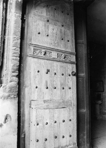 Des petites têtes de personnages en ronde bosse sont insérées dans un linteau.
