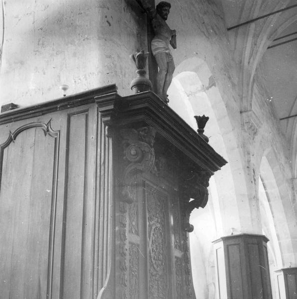 retable du maître-autel, chaire à prêcher, bancs de fidèles, lambris de revêtement, banc d'oeuvre