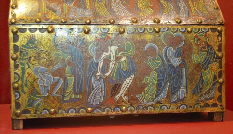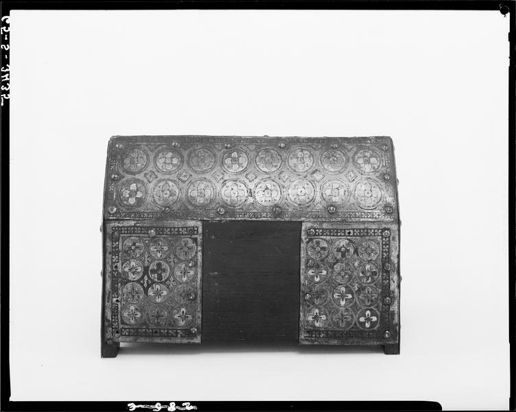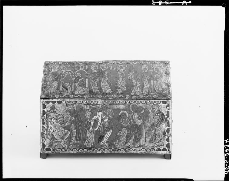 La face antérieure est ornée de personnages émaillés, têtes gravées et niellées d'émail rouge, sur fond gravé de rinceaux. Sur la face postérieure sont des plaques de cuivre dorées, ornées de rosaces se détachant sur un fond bleu lapis.