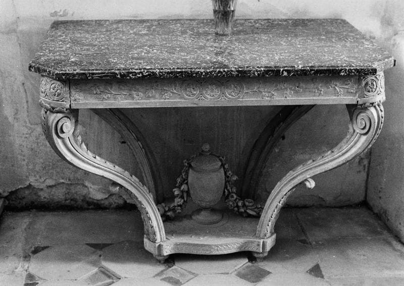 La tablette inférieure supporte une urne avec une guirlande de fleurs.