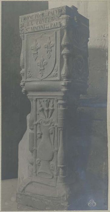 Armoiries (coffre supérieur) : écu à 3 fleurs de lys allongées. Armoiries (côté gauche) : écu chargé d'une épée à poignée en forme de croix pommetée ayant la pointe en bas.