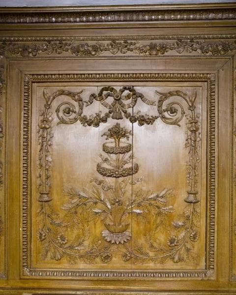 Boiseries aujourd'hui peintes faux bois teinte chêne clair. La corniche qui court tout autour des lambris, ornée d'une frise avec motifs en U entrelacés et oves, semble d'origine. Deux panneaux de milieu, remontés en vis-à-vis, encadraient probablement autrefois la cheminée : ils déploient une exubérance de motifs végétaux et animaliers dominés et contenus par un souci de symétrie. Le reste des lambris est constitué essentiellement de trumeaux (3 dont 2 moins hauts et en plein cintre) et de lambris d'appui sous glaces. (source : Domitille Cès, 2011)