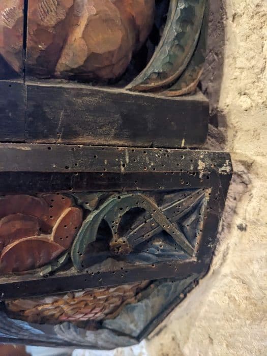 D'après la légende, saint Fiacre aurait vécu en ermite après avoir refusé la couronne d'Ecosse. Saint Faron lui accorda par la suite une terre près de Meaux afin d'y fonder un monastère : il lui sera donné autant de terrain qu'il lui sera possible d'en entourer d'un fossé en une journée. Après avoir tracé les limites avec son bâton, le fossé se serait miraculeusement creusé. Le saint, qui nourrira les pèlerins des produits de son jardin, est devenu patron des jardiniers. Il est représenté ici en ermite, sur un socle orné de fleurs et sous un dais de verdue et de fruits. Il porte une pelle sur l'épaule gauche et une croix dans la main droite. A ses pieds sont représentés de nombreux légumes : poireaux, carottes, choux, petits pois, pommes de terre, feuilles de vigne, potiron.