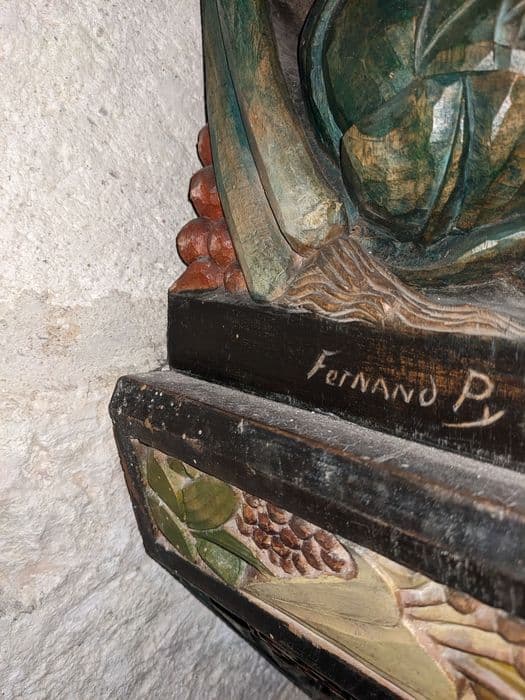 Noyer sculpté, polychrome. La statue, le socle et le dais sont sculptés dans un seul bloc. L'oeuvre, de style Art déco, représente saint Fiacre. Le socle porte le nom du saint et la signature de l'artiste.