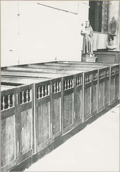 Dix-neuf rangées réparties sur chacun des côtés de la nef. Bancs clos décorés de barreaux moulurés dans la partie supérieures des côtés et des dossiers.