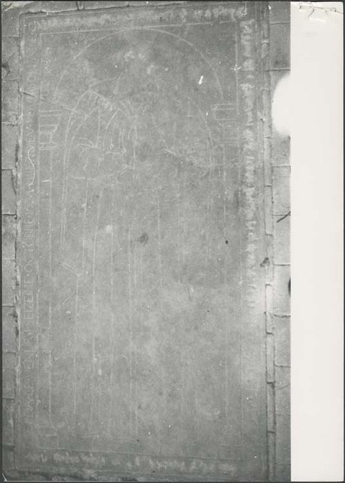 Avant d'être relevée contre le mur sud de la nef, cette dalle était dans le pavage de la nef, face au choeur.