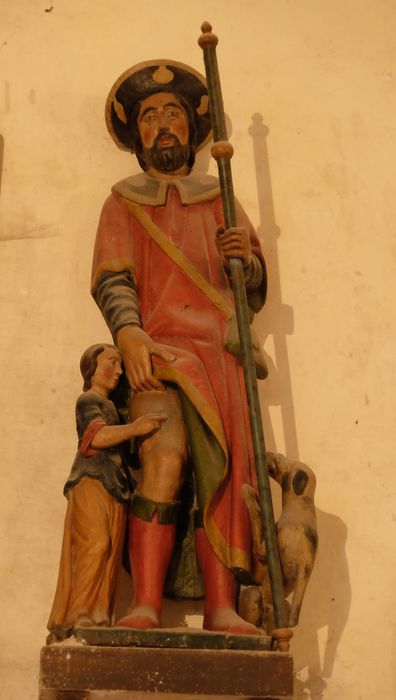En habit de pèlerin (chapeau à coquille, bourdon et besace), saint Roch découvre sa cuisse pour y montrer un bubon de la peste dont il fut atteint. Un enfant à sa droite désigne ce bubon de peste dans un geste de bénédiction. A la gauche du saint, un chien assis, un morceau de pain dans la gueule, le regarde et sollicite son attention en grattant son manteau de sa patte droite. Il s'agit du chien qui, volant du pain à la table seigneuriale de son maître, aurait nourri saint Roch pestiféré durant son retrait au fond de la forêt.