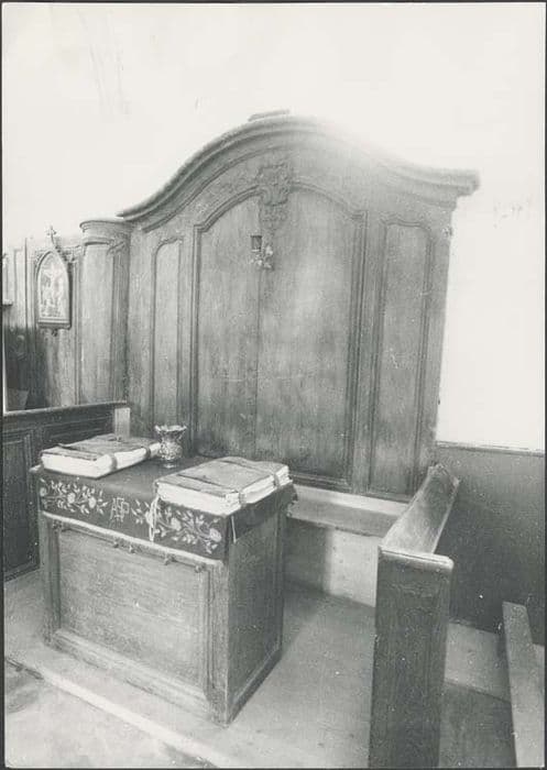 Banc d'oeuvre en partie démonté avec dorsal rectangulaire à oreille en panneaux de boiseries sculptés, moulurés et décorés dans leur partie supérieure de motifs végétaux.