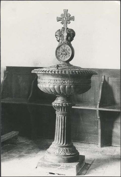 Ce genre de fonts baptismaux a été fait en série mais il est devenu assez rare aujourd'hui. Certainement issu des production Ducel, ces fonts sont identiques à ceux de l'église d'Auffargis (IM78000111) dans les Yvelines qui semblent être signés sur le socle : "J.J. Ducel maître de forges à Paris".
