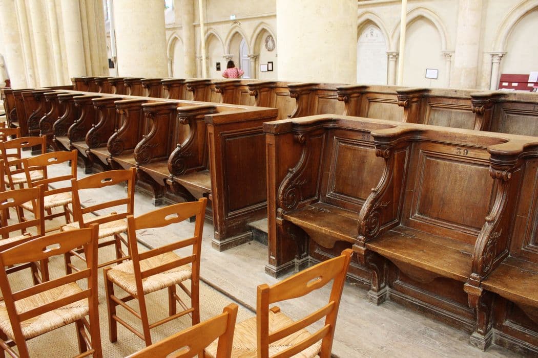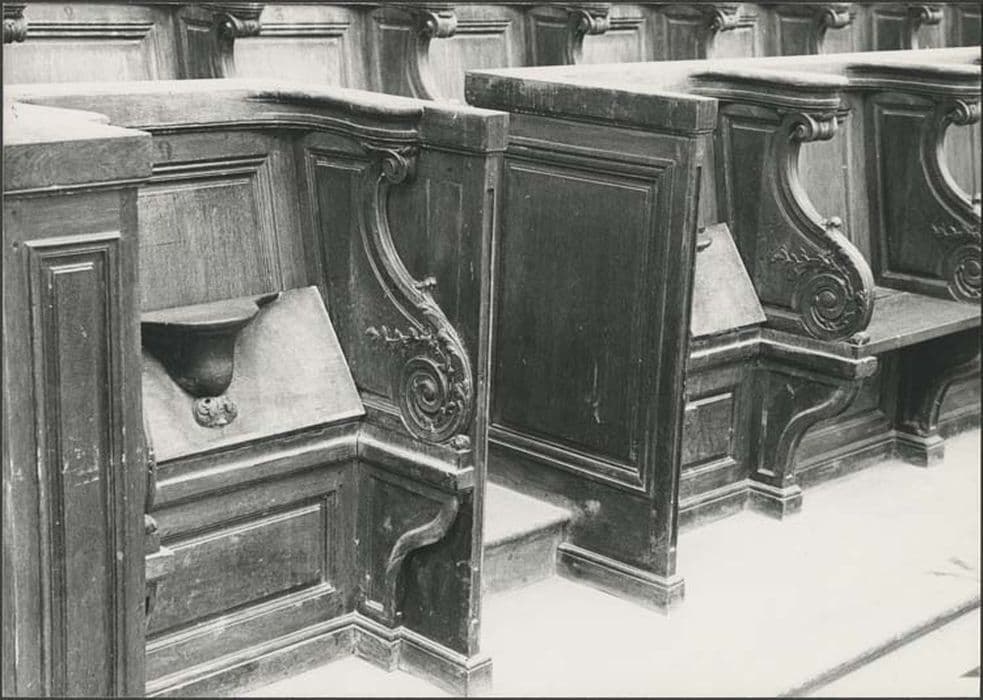Ensemble de stalles à panneaux moulurés, les jouées sont ornées de volutes végétales.
