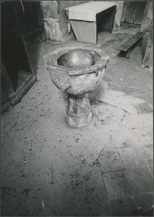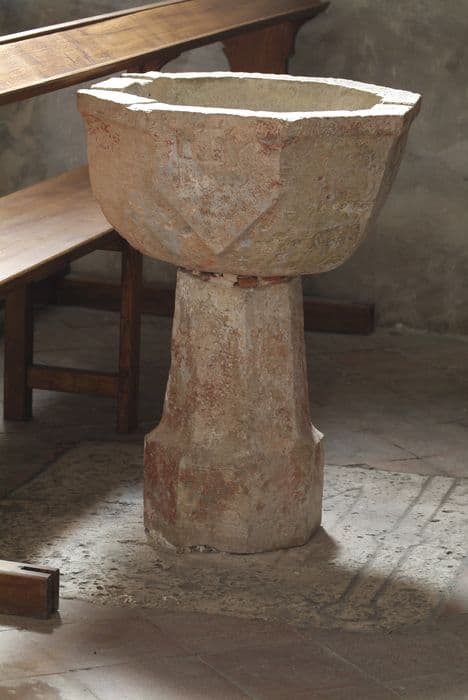 Fonts baptismaux octogonaux en pierre avec date inscrite dans un écusson. Les fonts sont placés sur un fragment de pierre tombale.