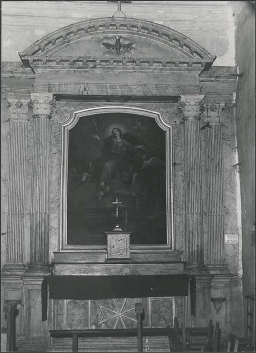 Retable à deux colonnes cannelées et deux pilastres cannelés, portant des chapiteaux corinthiens. Entablement droit et fronton courbe à corbeaux orné d'une colombe au centre. Au centre du retable, une huile sur toile représentant l'Assomption de la Vierge.