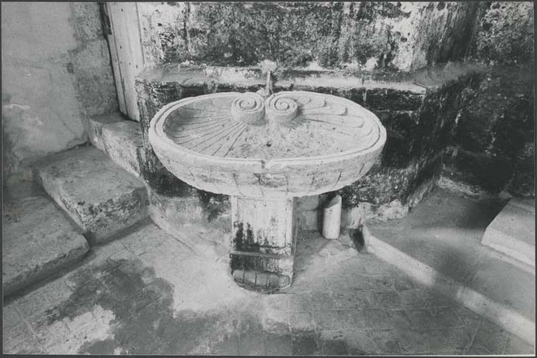 Bénitier en forme de coquille, la cuve est décorée de godrons sur l'extérieur, et l'intérieur est orné de palmettes et d'enroulements, le pied est cannelé. La facture de l'ornementation est de même style que celle des fonts baptismaux.