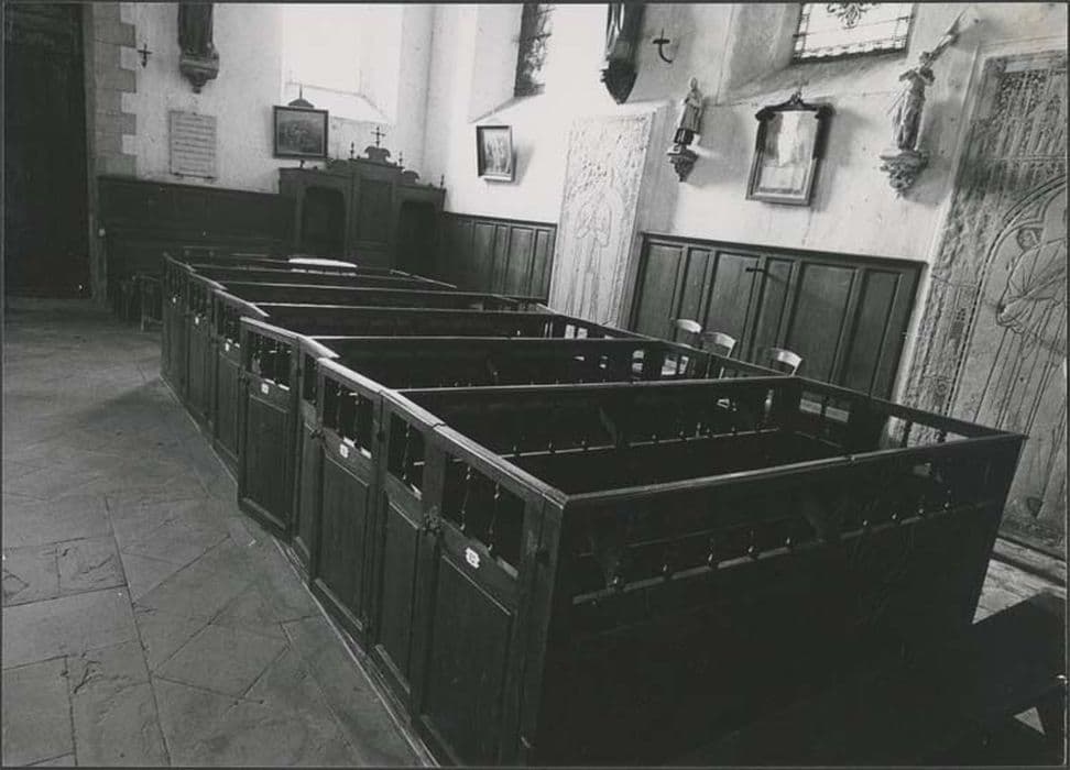 Ensemble des bancs clos de la nef en bois mouluré et tourné.