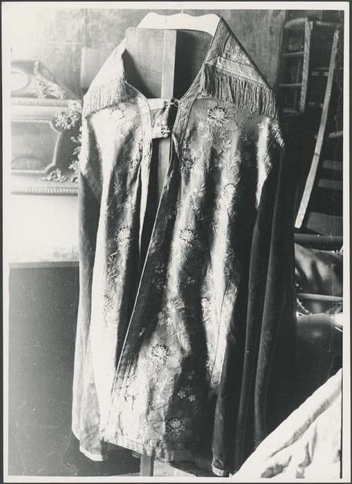 Chape à fond rouge, tissu broché de fleurs multicolores.
