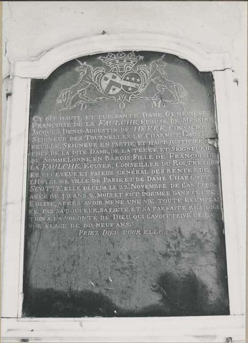 Plaque de marbre noir gravée et cintrée en partie haute, avec armes de Geneviève Françoise de la Faulche, femme de Jacques Denis Augustin de Heere, seigneur de Tournelle.