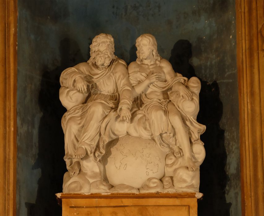 Le groupe est composé de deux éléments : l'ensemble du Père et du fils posé sur un piédestal dans une niche, et l'oiseau du saint Esprit, détaché du groupe, au dessus.