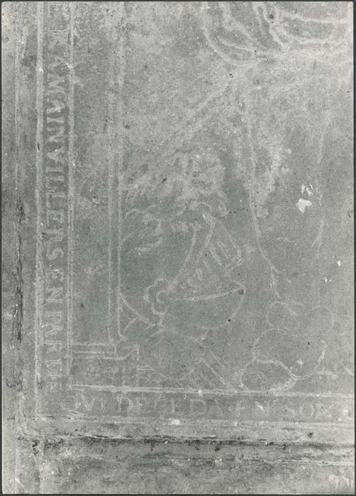 Dalle rectangulaire. L'inscription est tournée vers l'extérieur. Représentation du défunt en armure.
