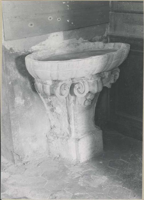 Bénitier avec fût terminé par des grosses volutes. La vasque en forme de coquille est rapportée.