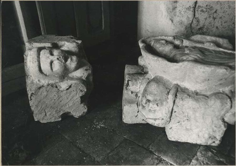 Fragments sculptés de cul-de-lampe à tête dont la bouche est ouverte.