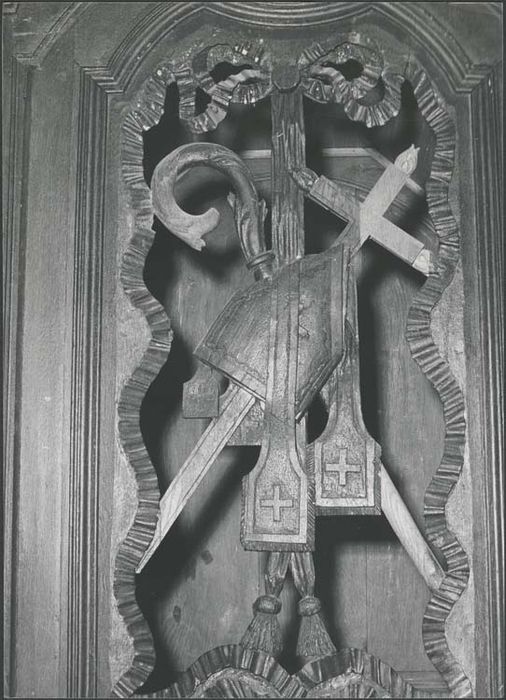 Confessionnal à ailes. Le fronton est cintré. Deux pilastres encadrent la porte. Le bord supérieur des ailes est ondulé.