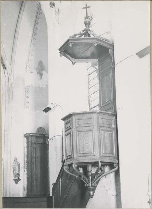 La chaire est simple : l'ambon est décoré de panneaux moulurés ainsi que le dosseret mais ces panneaux n'ont pas de décor ni l'abat-voix. Seul une croix posé sur un globe orne le dessus de l'abat-voix.