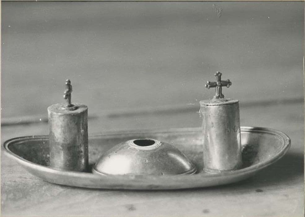 Chrémeau comprenant les ampoules aux Saintes Huiles regroupées dans une petite coupelle.