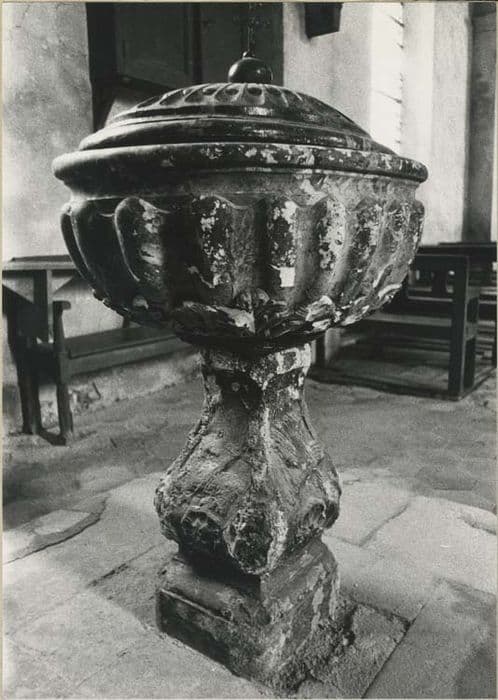Pieds en balustre sculpté et vasque ronde ; couvercle bombé. Les fonts sont peints faux-marbre.