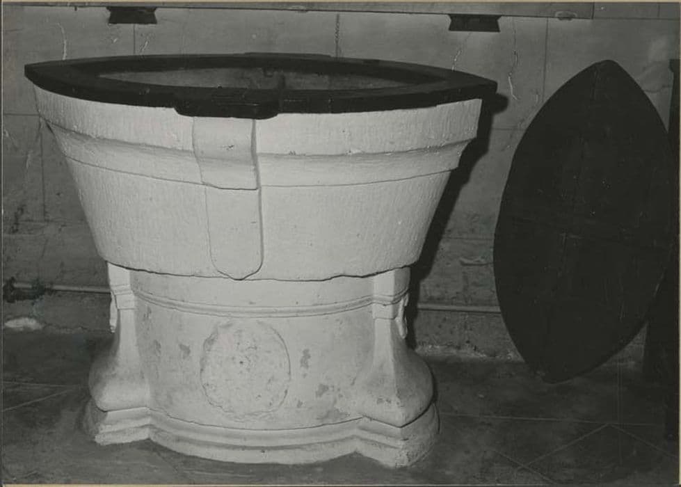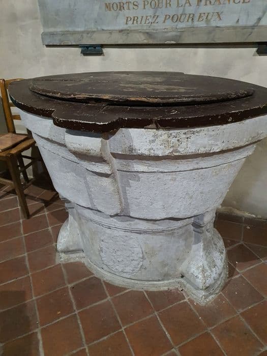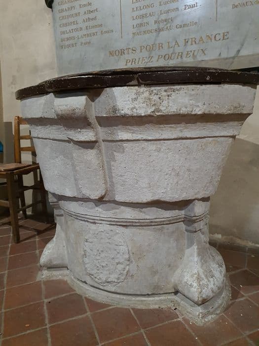 Fonts baptismaux en pierre en forme de navette, armoiries mutilées sur le pied. Rebord des fonts et couvercle en bois.