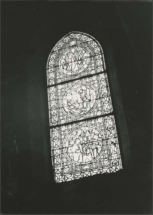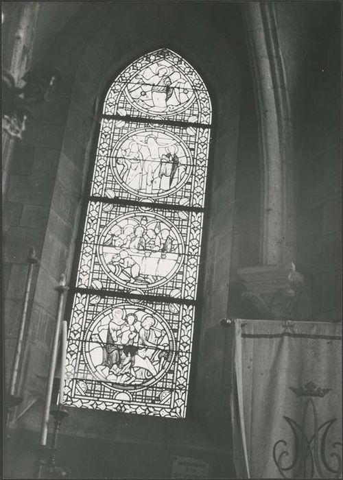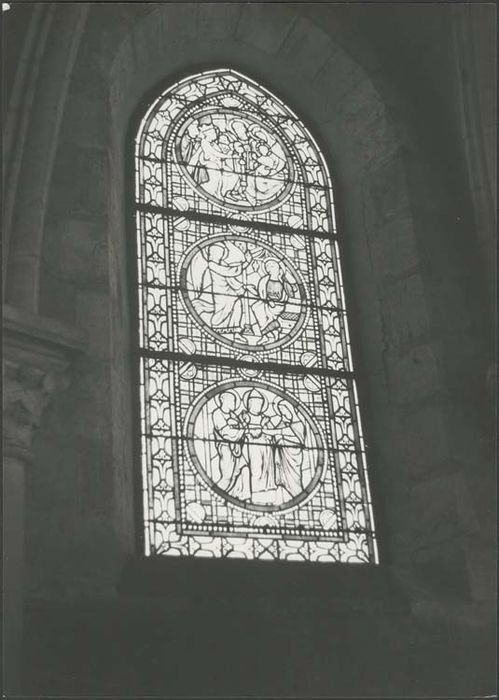 Baies à une seule lancette. Les vitraux de l'absidiole nord comprennent trois registres, ceux du sud, quatre registres