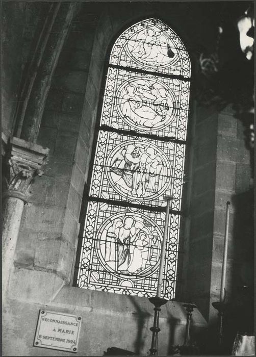 Dans le choeur, deux vitraux représentant le Baptême de Clovis. Absidiole sud, dans des médaillons de haut en bas : au nord-est la Nativité, l'Annonciation et la Présentation de la Vierge au Temple ; au centre, la Crucifixion, la Cène et la Fuite en Egypte ; au sud-est, le Couronnement de la Vierge, la Dormition et la Pentecôte. Absidiole nord, dans des médaillons de haut en bas : au nord-est, l'Adoration des Mages, l'Annonciation et le Mariage de la Vierge ; au centre, saint Joseph charpentier, Sainte Famille et Présentation au Temple ; au sud-est, la gloire de saint Joseph, la mort de saint Joseph et Jésus parmi les docteurs.