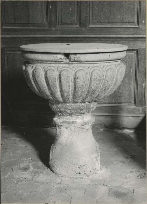 Fonts baptismaux en pierre, cuve décorée de godrons, couvercle en bois. Grille de clôture des fonts en fer forgé sur une seule longueur du 19e siècle (non protégée).