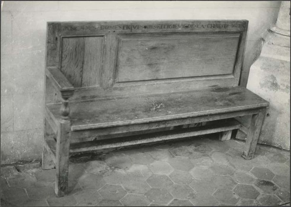 Ensemble de bancs avec accoudoirs sculptés. Un des bancs porte une inscription.
