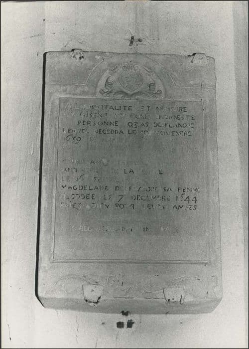Plaque funéraire à épitaphe gravée et avec armoiries sculptées au-dessus de l'épitaphe.