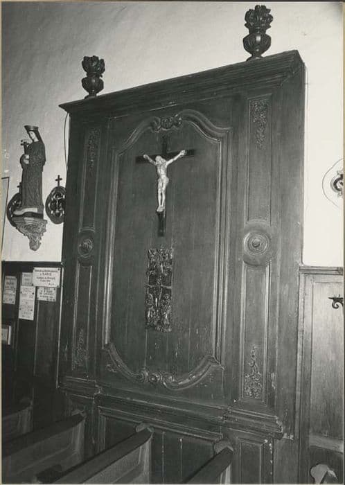 Dossier du banc d'oeuvre avec un bas-relief au centre représentant la Crucifixion. Grand panneau mouluré au centre encadré par des panneaux plus petits avec des motifs végétaux.