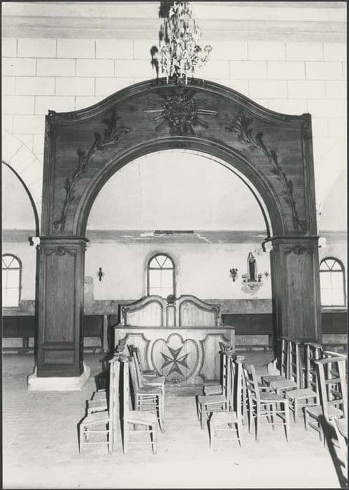 Banc d'oeuvre de petites dimensions orné d'une croix de Malte. Il est encadré par un arc lambrissé monumental qui s'appuie sur les piliers nord de la nef et l'arc en plein cintre qui les relie : un décor se déploie autour de cet arc.